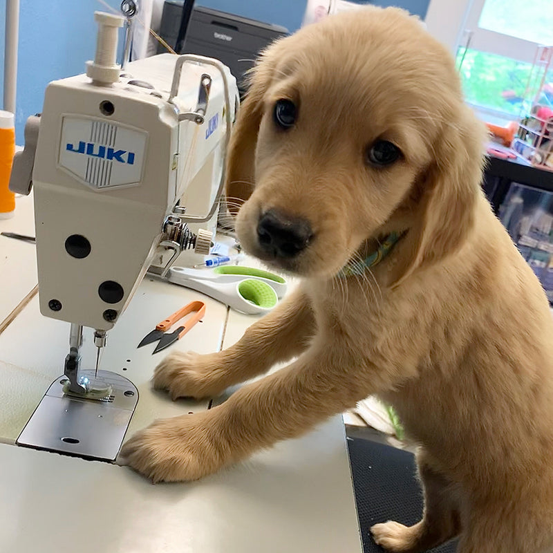 Sewing isn't just a job for Angie; her pup, Roadie, has taken on a few duties.